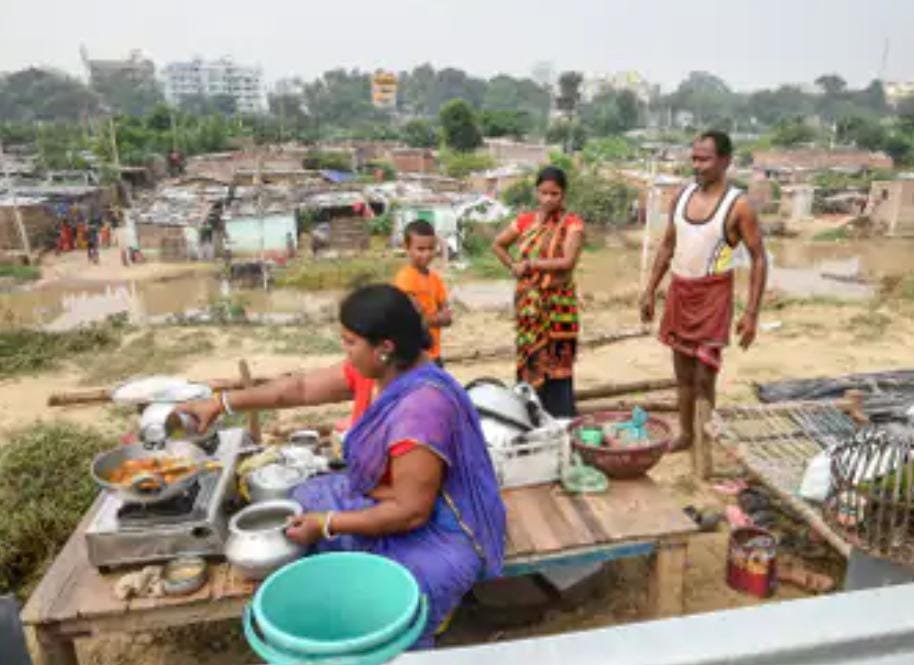 देश के अधिकांश राज्यों में बारिश ने कई लोगों के घर उजाड़ दिए हैं। सबसे बुरा हाल नदियों के किनारे बसे शहरों का है। बिहार की राजधानी पटना में भी कई क्षेत्रों में भी भारी बारिश के बीच घरों में पानी भरा हुआ है। अधिकांश लोगों ने तो राहत शिविर में शरण ले ली है लेकिन कुछ खुले में ही रहने को मजबूर हैं। पटना में खुले आसमान के नीचे ही रह रहे हैं। खुले में ही इन्हें खाना बनाना पड़ रहा है। सिर्फ पटना ही नहीं, उत्तर प्रदेश के बनारस, प्रयागराज, मिर्जापुर आदि जिलों में भी बाढ़ के बाद यही हाल है।