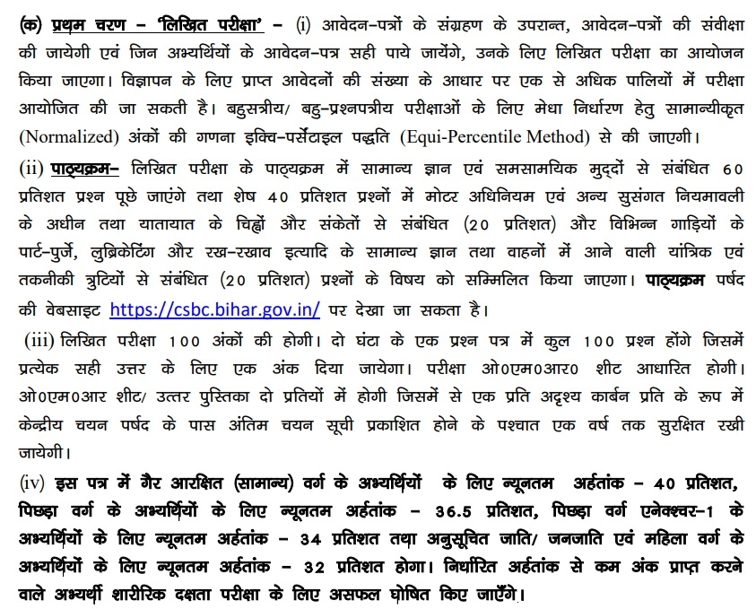 बिहार पुलिस कॉन्स्टेबल ड्राइवर परीक्षा एक OMR आधारित लिखित परीक्षा है। इसमें उम्मीदवारों से कुल 100 प्रश्न पूछे जाएंगे।
