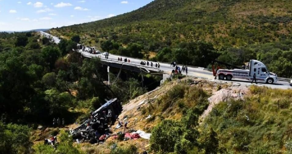 मेक्सिको एक बड़ा सड़क हादसा हो गया। मेक्सिको के केंद्रीय राज्य जकाटेकास में शनिवार को एक राजमार्ग पर एक बस के दुर्घटनाग्रस्त हो जाने से 19 लोगों की मौत हो गई और छह अन्य घायल हो गए। स्थानीय अधिकारियों ने कहा कि यात्रियों से भरी बस एक मक्के से भरे ट्रैक्टर-ट्रेलर से पीछे से टकरा गई। टक्कर इतनी जबरदस्त थी कि दोनों वाहन खाई में गिर गए। हादसे में मरने वाले लोग मेक्सिको के ही निवासी हैं। शवों को खाई से निकालकर अस्पताल पहुंचा दिया गया है। पोस्टमार्टम के बाद परिजनों को दिए जाएंगे। स्थानीय अधिकारियों ने बताया कि मेक्सिको के केंद्रीय राज्य जकाटेकास में शनिवार को एक बस हाईवे पर दुर्घटनाग्रस्त हो गई। यह हादसा सुबह के समय हुआ है। जानकारी ये भी सामने आई है कि हादसे का शिकार हुई बस सिउदाद जुआरेज़ जा रही थी, ये शहर अमेरिका-मेक्सिको सीमा पर चिहुआहुआ राज्य में स्थित है। इस घटना की जो तस्वीरें सोशल मीडिया पर शेयर की गई है उनमें बचाव दल को घटनास्थल पर शवों को निकालते हुए दिखाया गया है। राज्य के अटॉर्नी जनरल ने बताया कि 19 लोगों की मौत हुई है जबकि 6 लोग घायल हैं। एक स्थानीय सरकारी अधिकारी ने नाम न बताने की शर्त पर न्यूज एजेंसी रॉयटर्स को बताया कि शनिवार की सुबह हादसे के बाद खाई में गिरे कुछ शवों को निकालने के प्रयास जारी थे।