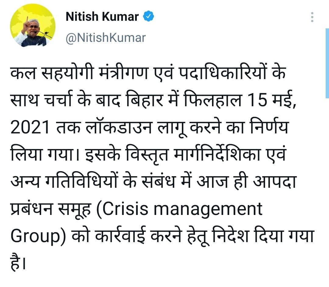 बिहार में भी लग सकता है लॉकडाउन, सीएम नीतीश कुमार ने उच्चाधिकारियों की बुलाई आपातकालीन बैठक Read More...