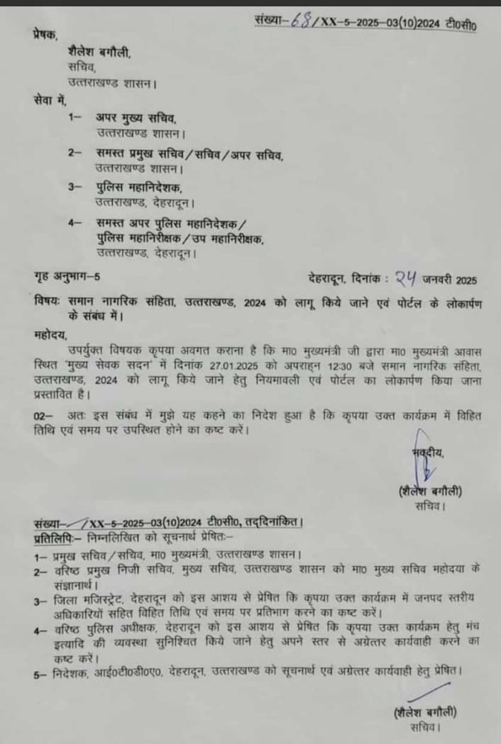 उत्तराखंड में यूसीसी कानून 27 जनवरी से होगा लागू, शासन की ओर से सभी विभागों को भेजा गया पत्र Read More...