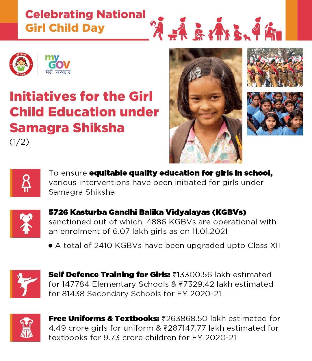 On National Girl Child Day, Ministry of Education has started ‘Samgra Shiksha’ Scheme for encouraging Girl education and higher enrollment Read More...