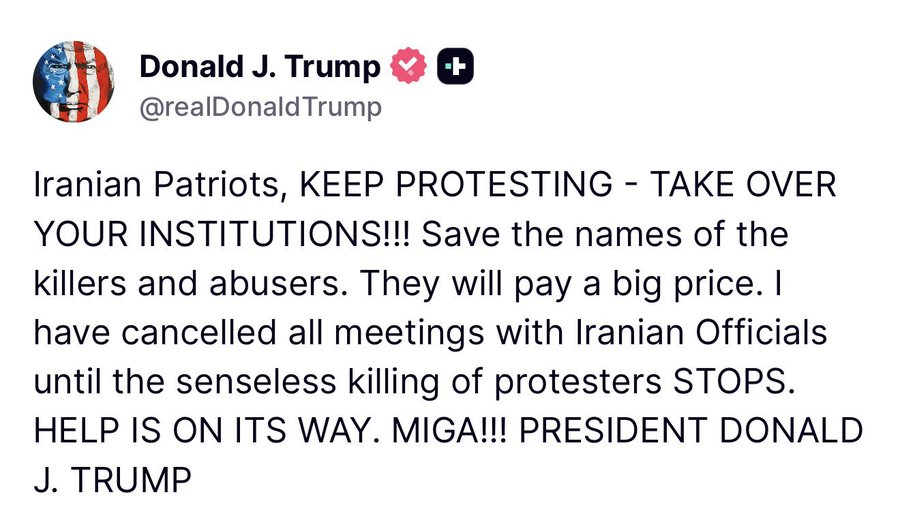 ट्रंप ने अपने सोशल मीडिया प्लेटफॉर्म पर ईरानी नागरिकों से प्रदर्शन जारी रखने की अपील की। उन्होंने लिखा कि अमेरिका उनकी आवाज सुन रहा है और जरूरत पड़ने पर मदद करेगा।