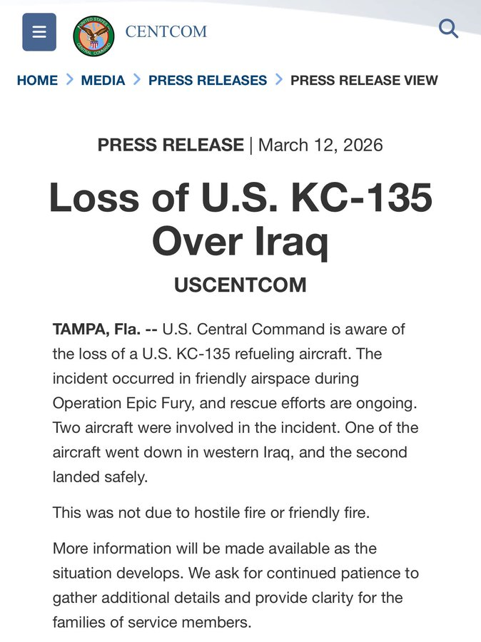 पश्चिमी इराक में अमेरिकी KC-135 रिफ्यूलिंग विमान दुर्घटनाग्रस्त हो गया। ईरान समर्थित गुट ने हमले की जिम्मेदारी ली, जबकि अमेरिका ने तकनीकी कारणों की आशंका जताई।