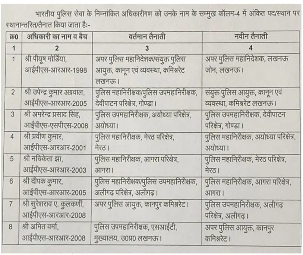 उत्तर प्रदेश में पुलिस और प्रशासनिक अधिकारियों के ट्रांसफर का दौर जारी है। शनिवार देर रात एक बार फिर योगी सरकार ने 8 वरिष्ठ आईपीएस अधिकारियों के तबादले किए हैं। शासन की ओर से ट्रांसफर किए गए आईपीएस अफसरों की लिस्ट भी जारी कर दी गई है। खास बात ये है कि इस बार लंबे इंतजार के बाद जोन व रेंज स्तर पर फेरबदल किया गया है। शासनादेश के मुताबिक लखनऊ के ज्वाइंट कमिश्नर लॉ एंड ऑर्डर पीयूष मोर्डिया भी शामिल हैं। इन्हें अब एडीजी लखनऊ जोन की जिम्मेदारी दी गई है। आईजी रेंज मेरठ में तैनात प्रवीण कुमार को आईजी रेंज अयोध्या, लखनऊ पुलिस कमिश्नरेट में ज्वाइंट सीपी पीयूष मोर्डिया एडीजी जोन लखनऊ, आईजी रेंज अलीगढ़ से दीपक कुमार को आईजी रेंज आगरा, आईजी आगरा रेंज नचिकेता झा को आइजी रेंज मेरठ, अमित वर्मा को कानपुर पुलिस कमिश्नरेट में अपर पुलिस आयुक्त, सुरेश राव ए कुलकर्णी को उप महानिरीक्षक अलीगढ़, अमरेंद्र प्रताप सिंह को पुलिस उप महानिरीक्षक देवीपाटन, आईजी रेंज देवीपाटन मंडल में तैनात उपेंद्र अग्रवाल को ज्वाइंट सीपी कानून व्यवस्था लखनऊ में तैनाती दी गई है। बता दें कि इससे पहले बीते 4 मार्च को 3 आईपीएस अफसरों का ट्रांसफर किया गया था।
