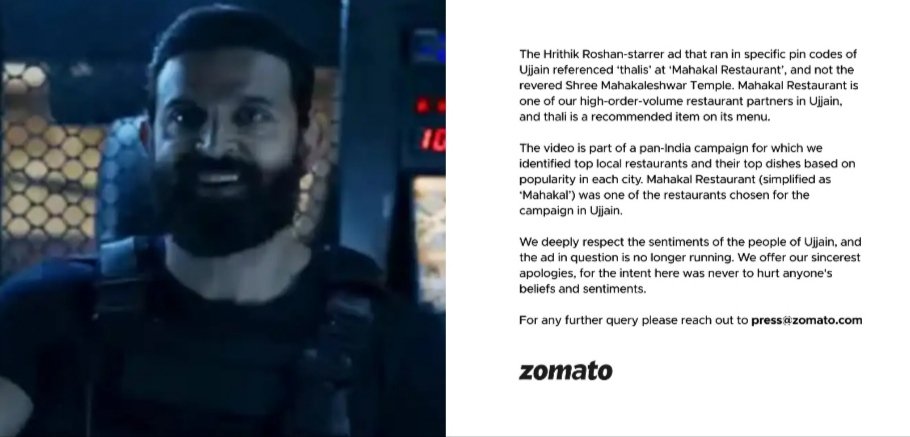 आखिरकार जोमैटो कंपनी को मध्य प्रदेश के उज्जैन स्थित महाकाल मंदिर के पुजारियों के विरोध के आगे झुकना पड़ा। वहीं मध्य प्रदेश के गृह मंत्री नरोत्तम मिश्रा ने भी पूरे मामले की जांच के आदेश दिए थे। उसके बाद ऑनलाइन फूड डिलीवरी कंपनी जोमैटो ने महाकाल थाली ऐड को हटा लिया है और माफी भी मांग ली है। कंपनी ने सोशल मीडिया पर कहा कि ऋतिक रोशन ने महाकाल रेस्टोरेंट से थाली मंगाने की बात कही थी, न कि महाकालेश्वर मंदिर से। इस मामले में मंदिर के पुजारियों ने नाराजगी जताई थी। इसके बाद बायकॉट जोमैटो ट्रेंड हो रहा था।